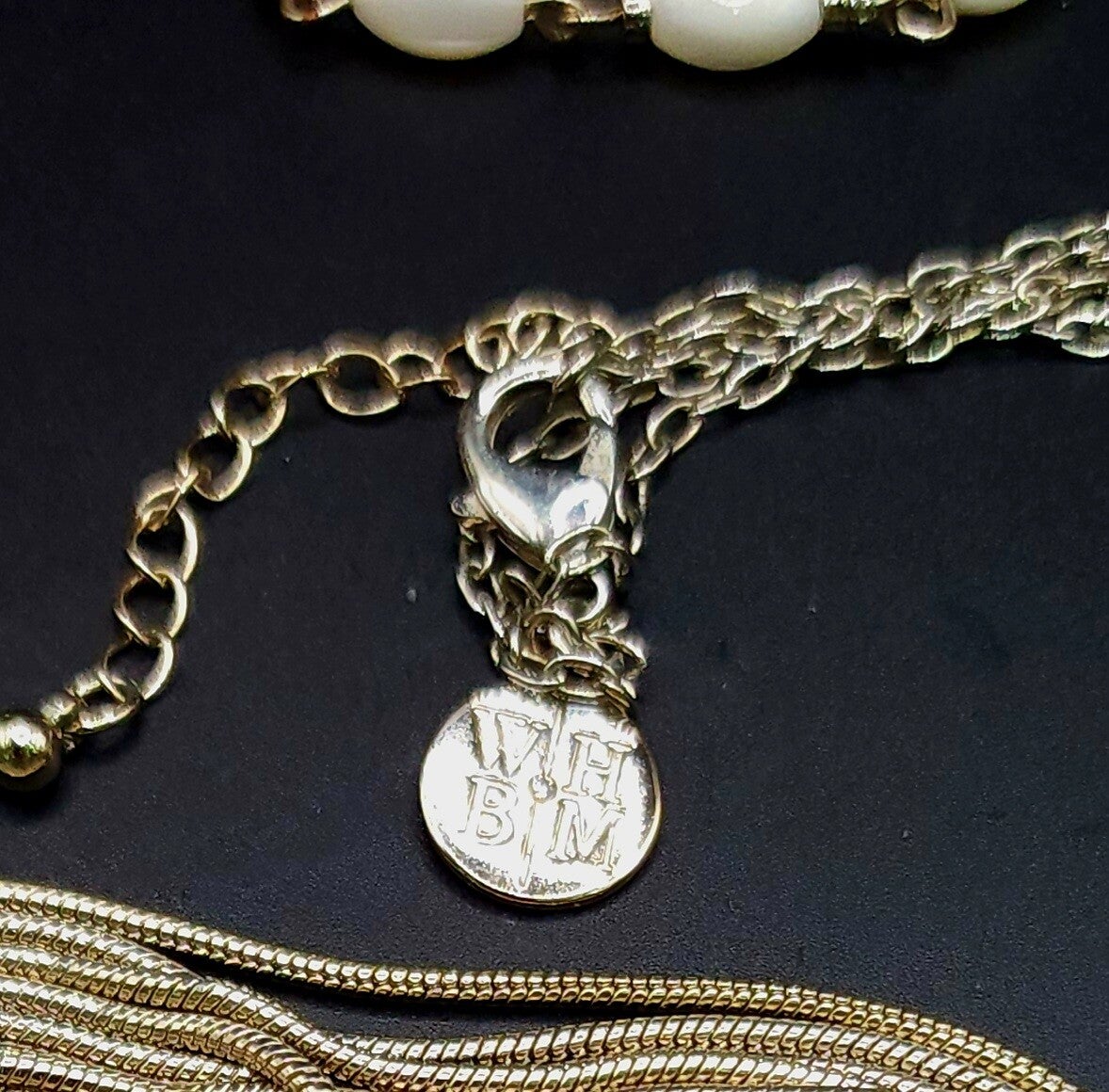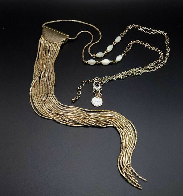White House Black Market Design w/logo tag Length: 32" chain plus 10" Fringe, Insert 1 1/4" x 1", MOP Beads, Overall nice finish