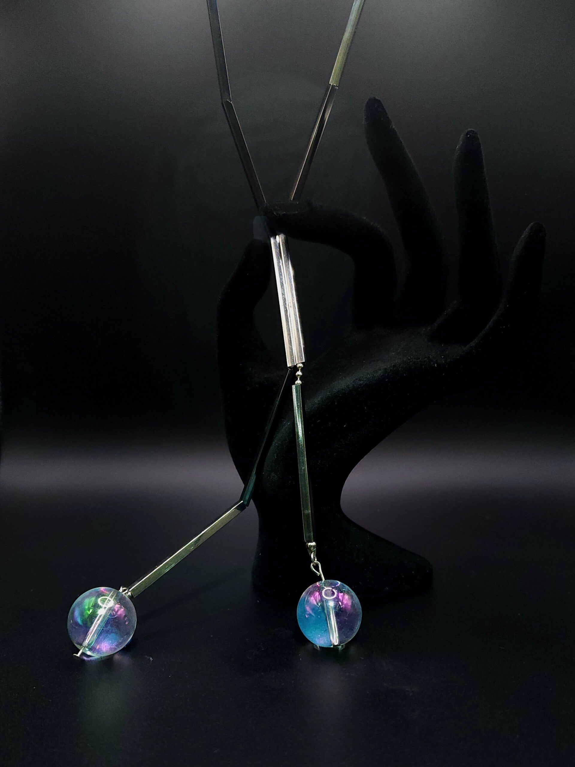 Long & Very Swingy Necklace Irridescent Glass Beads Stainless Steel Extra long ball chain 48"L (24" Drop) Beads 3/4"