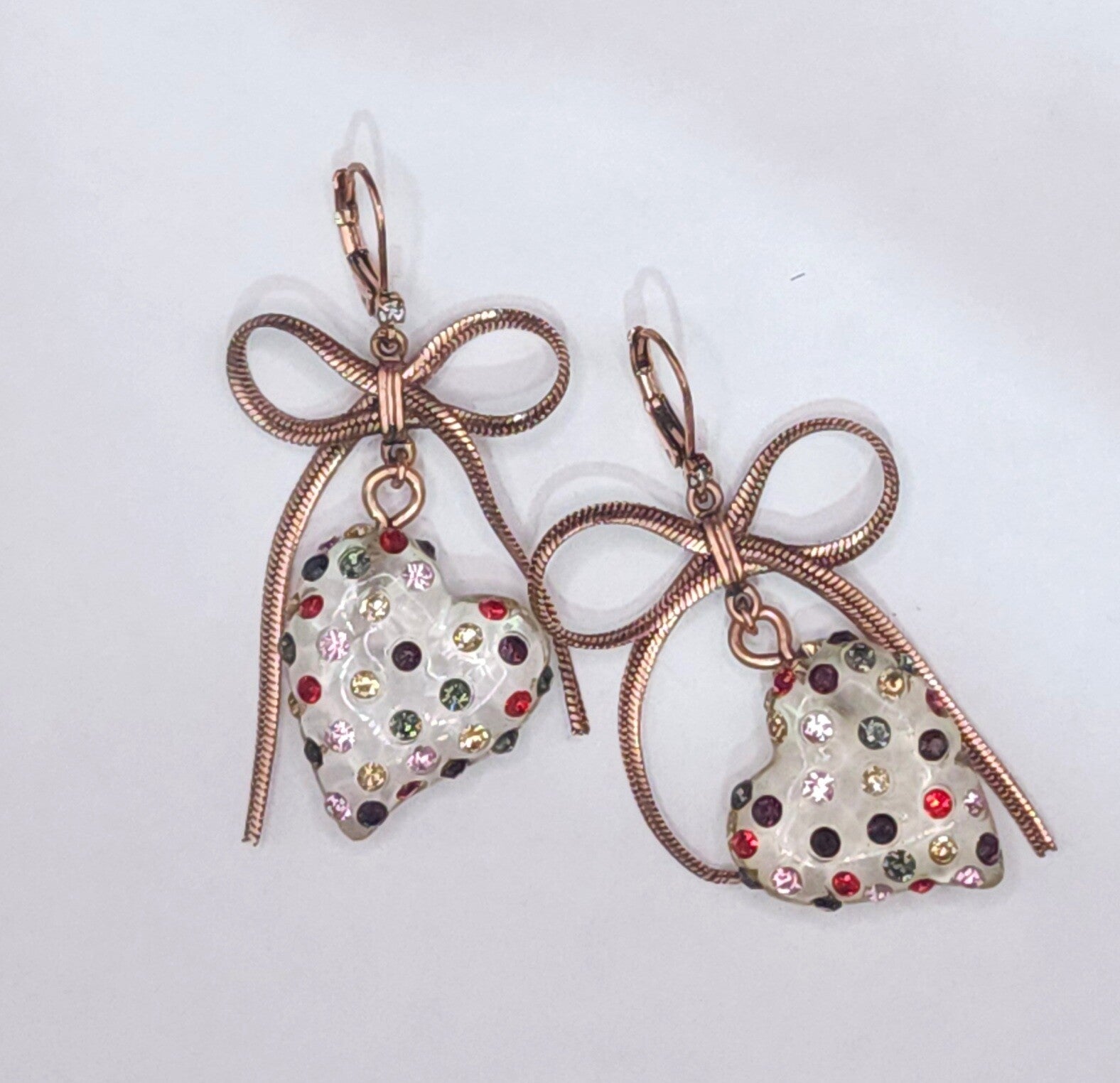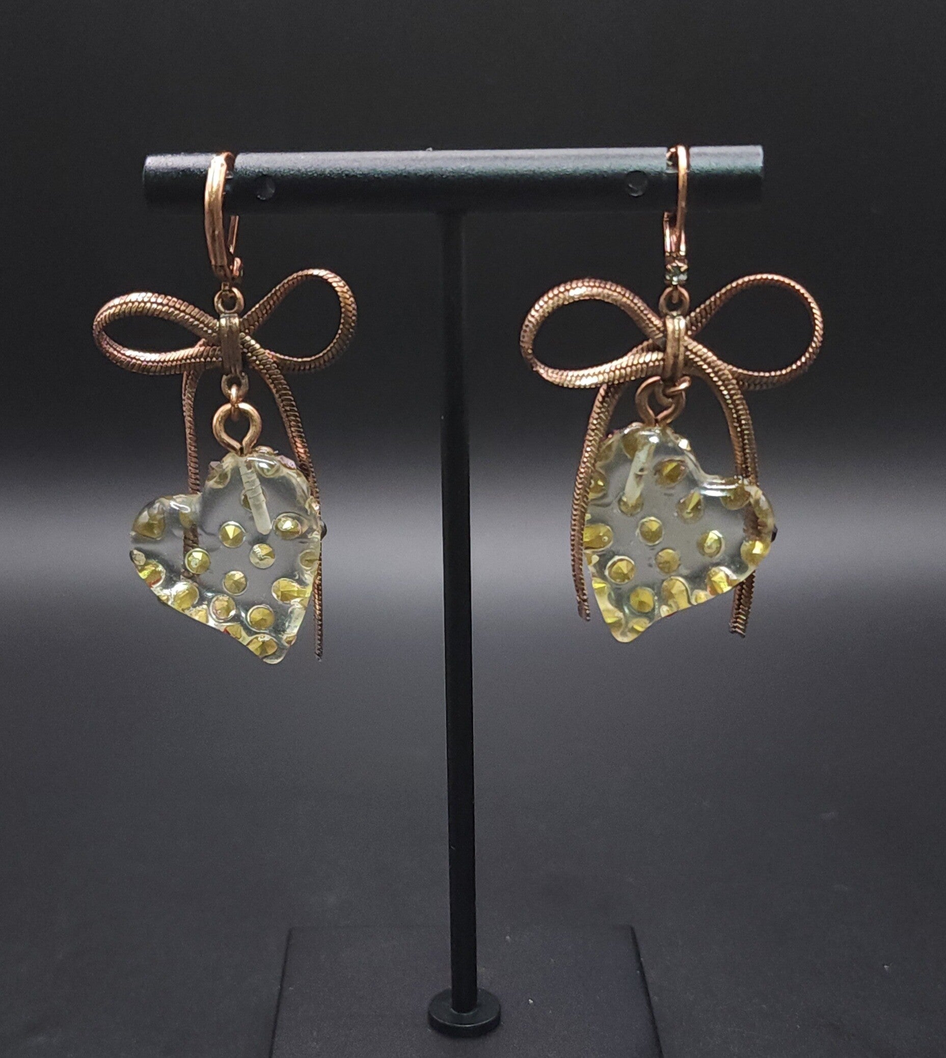 These earrings just caught me eye... cute & kitsch combine for that perfect combination of nostalgia & fun. Very, very sparkly as you can see in the video. The bows and earwires appear to be copper. Well made and sure to start many interesting conversations... they are yours to embellish ~ the story that is!