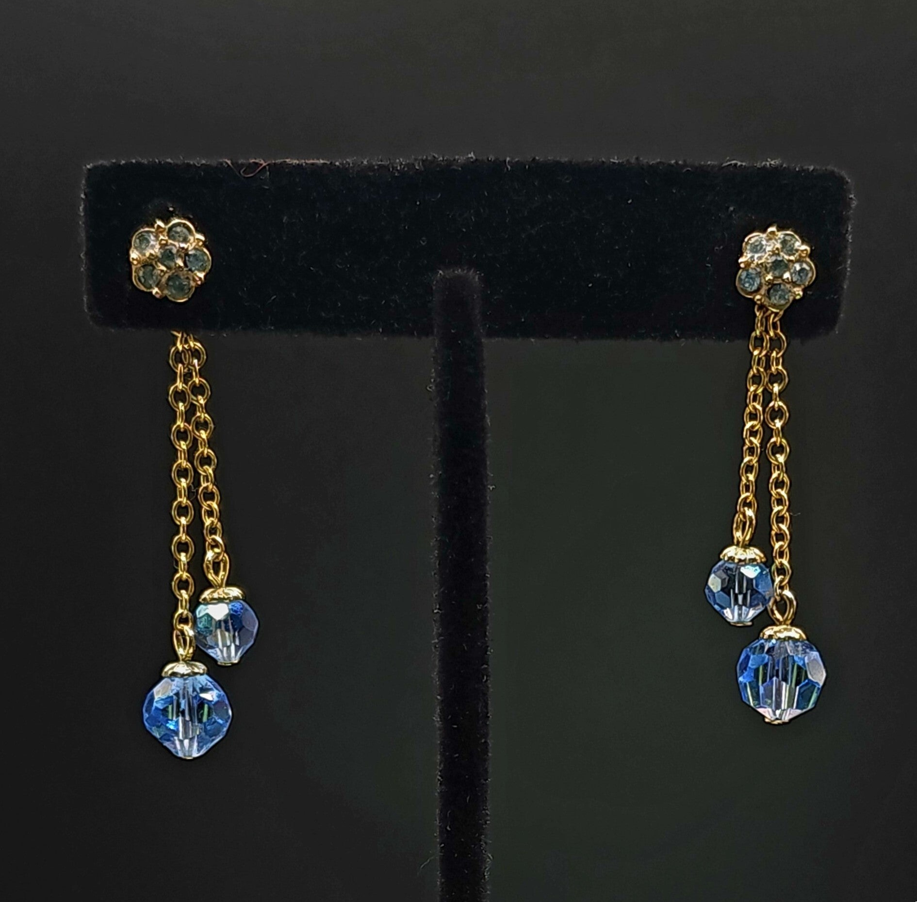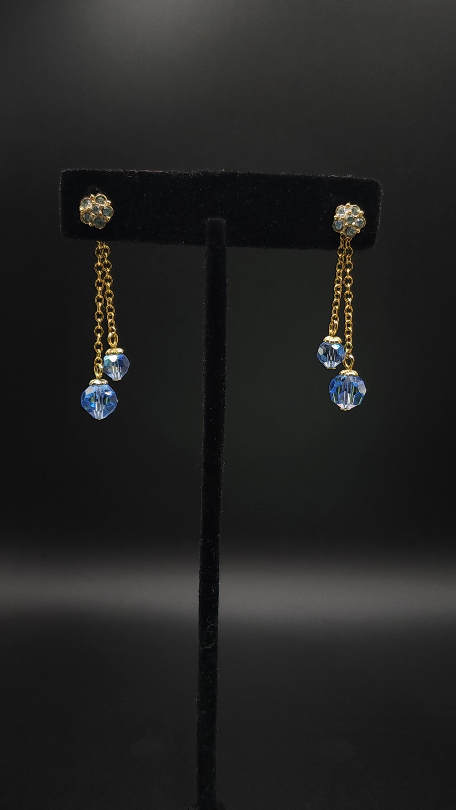 These pretty little earrings have great swing and lovely aquamarine-like glass bead dangles. The ball post has 6 tiny blue faceted stones which can be worn separately from the drops.